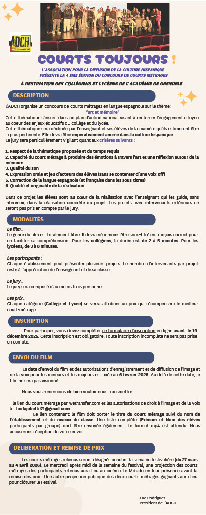 En partenariat avec l’association Gciné et Le Mikado, un défi lancé aux collégiens et lycéens de l’Académie de Grenoble : la réalisation d’un court-métrage en espagnol sous-titré en français, impérativement ancré dans la culture hispanique.